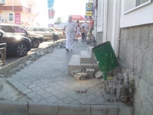 Строительные работы на тротуате в центре Алушты напротив здания исполкома, начатые еще весной, не закончены до сих пор и, более того, находятся в состоянии ступора. Для прокладки коммуникаций тротуарная плитка была разобрана, и вот уже около 2 месяцев ее никак не приведут в порядок, так что жители и гости города вынуждены обходить эту незаконченную стройку. Кстати, ремонт парапета на центральной набережной также не закончен, и длится уже месяц.